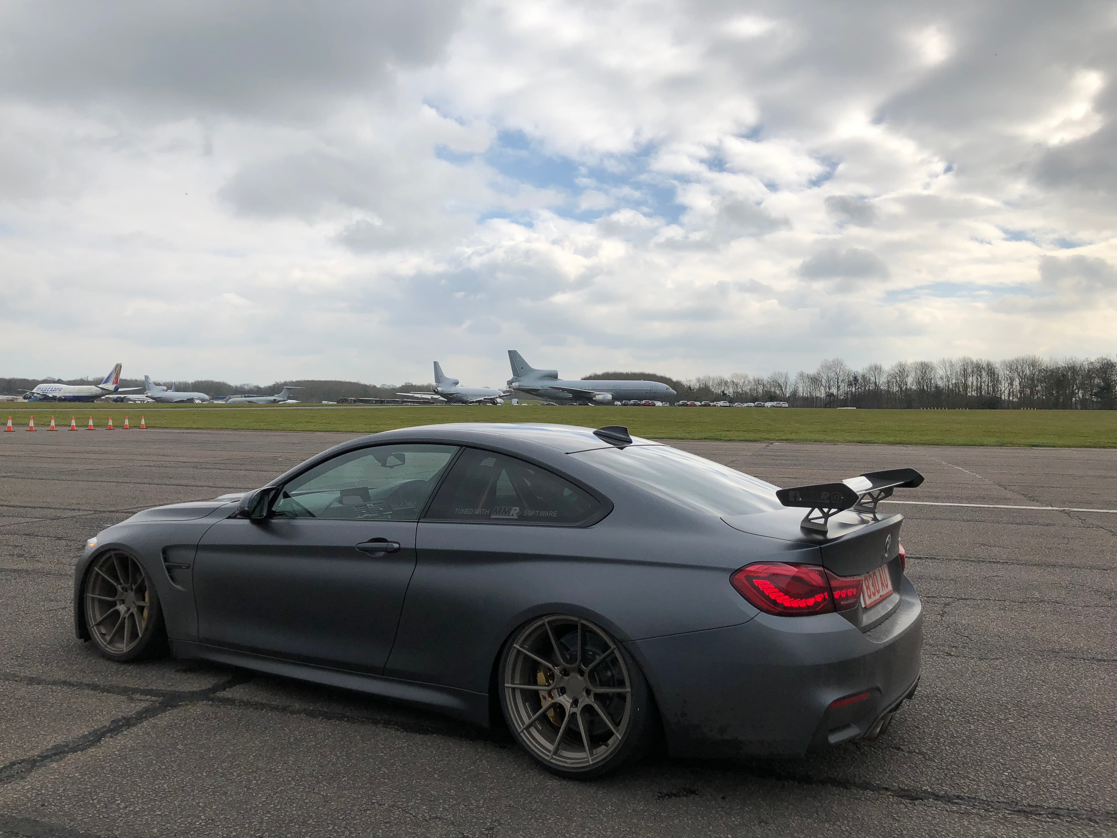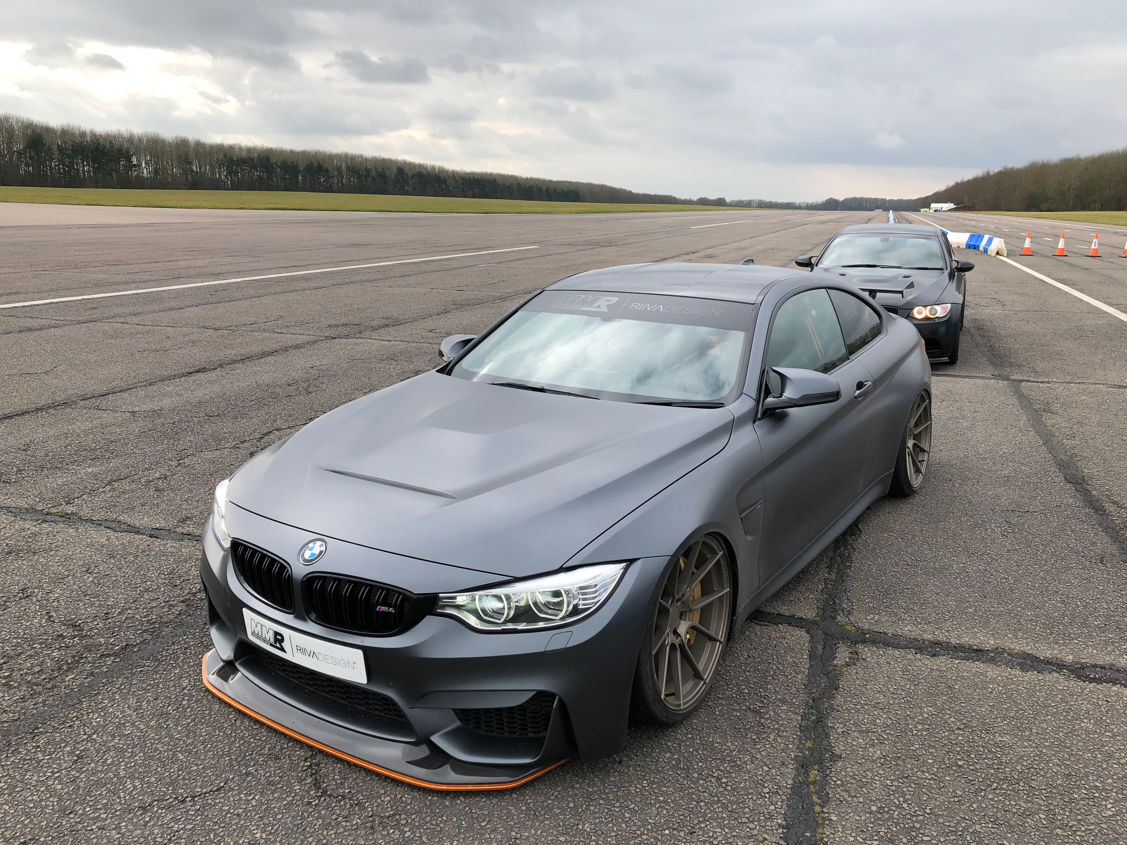 It’s the fastest BMW road car ever. And this particular GTS been made even faster with software tuning courtesy of MMR+ tuning system installed. Power now stands at 550 bhp and Max recons this will crack 200mph. So it’s a handful, then? Yes, it’s an absolute animal. We slid into the carbon bucket seat, which is 50% lighter than standard, and Max righteously launched us down the runway at Bruntingthorpe. First, second and third gears disappear in clouds of smoke. Traction is a thing that’s only mildly achieved when Max clicks the DCT into fourth gear. The M4 snakes its way past 120 mph and the Air Lift Performance F8x kit helps to keep the mania in check. It’s quite the experience.