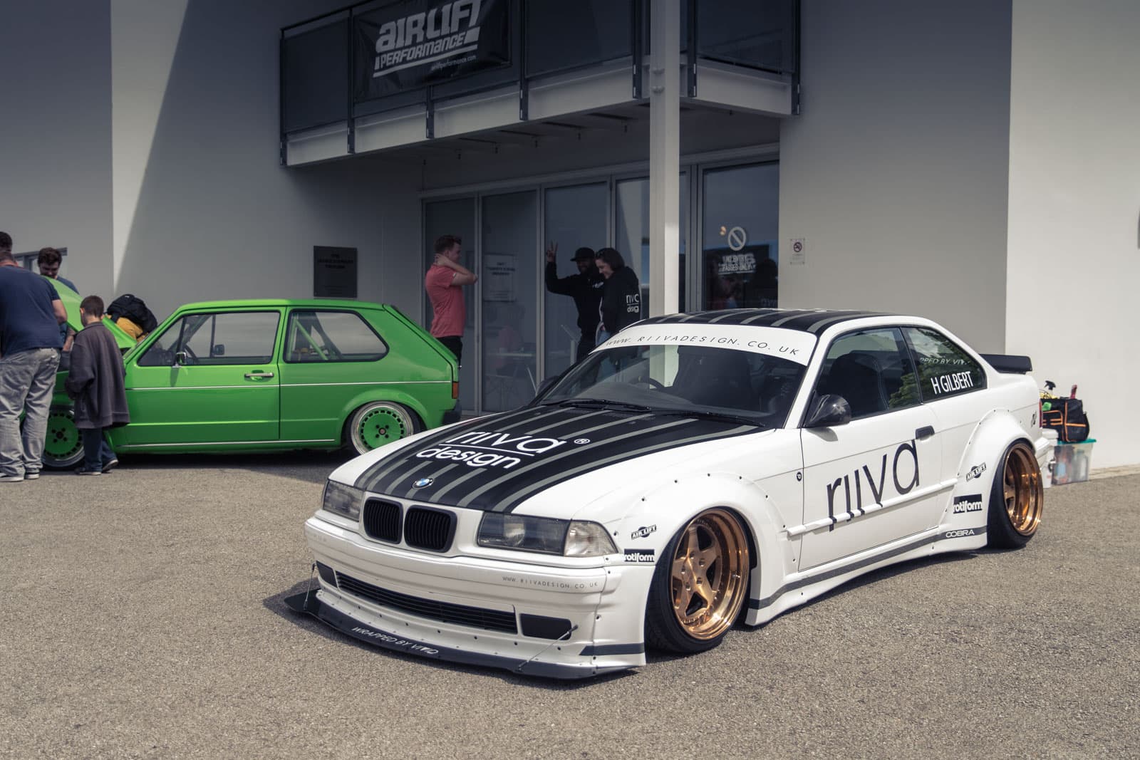 In contrast to the A6, the E36 used a wide body Sarto Racing bodykit to create a race style exterior. Wrapped by Vivid Vinyl, the BMW build uses Air Lift Performance parts throughout to drop the car over custom Rotiform ROC wheels in a gold finish.