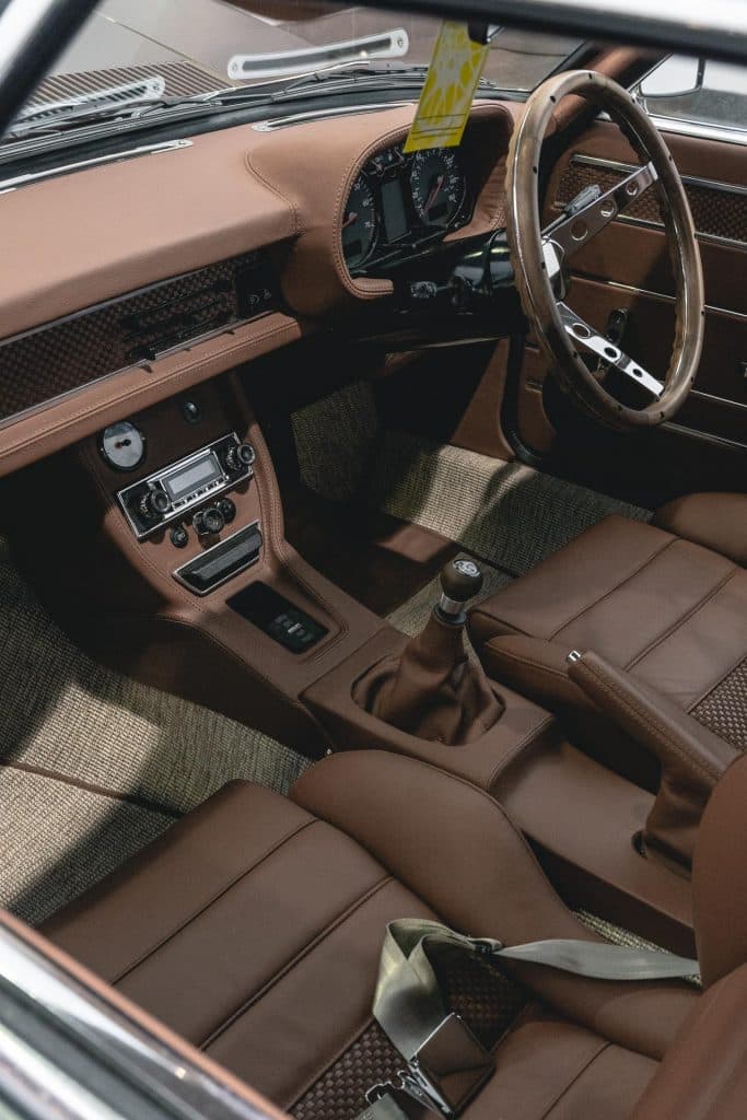 Inside the car a mix of leather and wood covered the surfaces, with a custom mount housing the Air Lift Performance 3P controller. It integrates the modern tech into the ’70s interior perfectly.